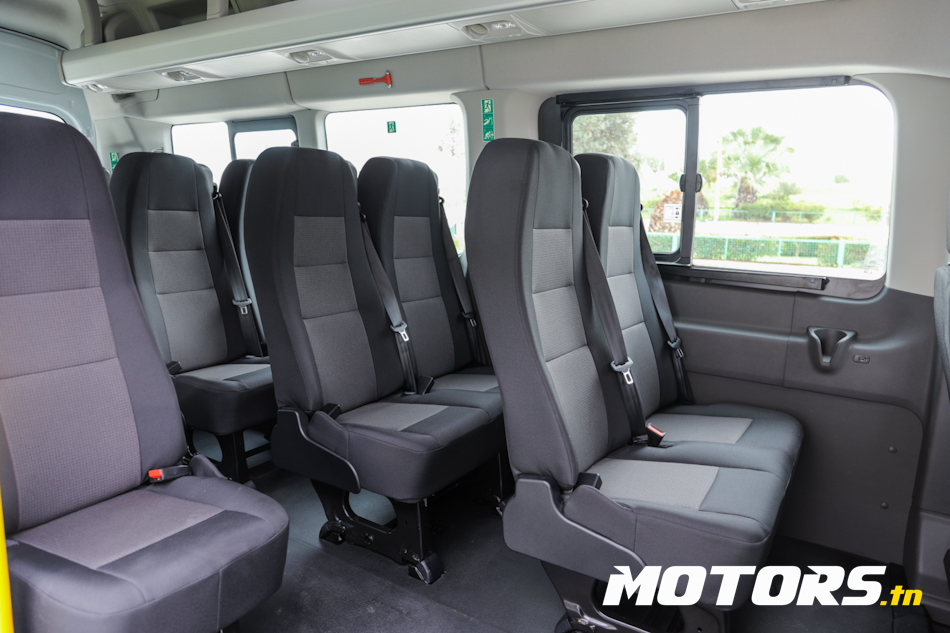 Avec une configuration de 18 places, ce minibus se distingue par sa conception fonctionnelle. L’accès à bord est facilité par une porte latérale coulissante et un marchepied latéral escamotable électriquement facilitant l’accès, notamment pour les usages intensifs, permettant une montée et une descente rapides des passagers. Ses dimensions généreuses, avec 6,70 mètres de longueur, 2,13 mètres de largeur et 2,76 mètres de hauteur, assurent un espace intérieur confortable.